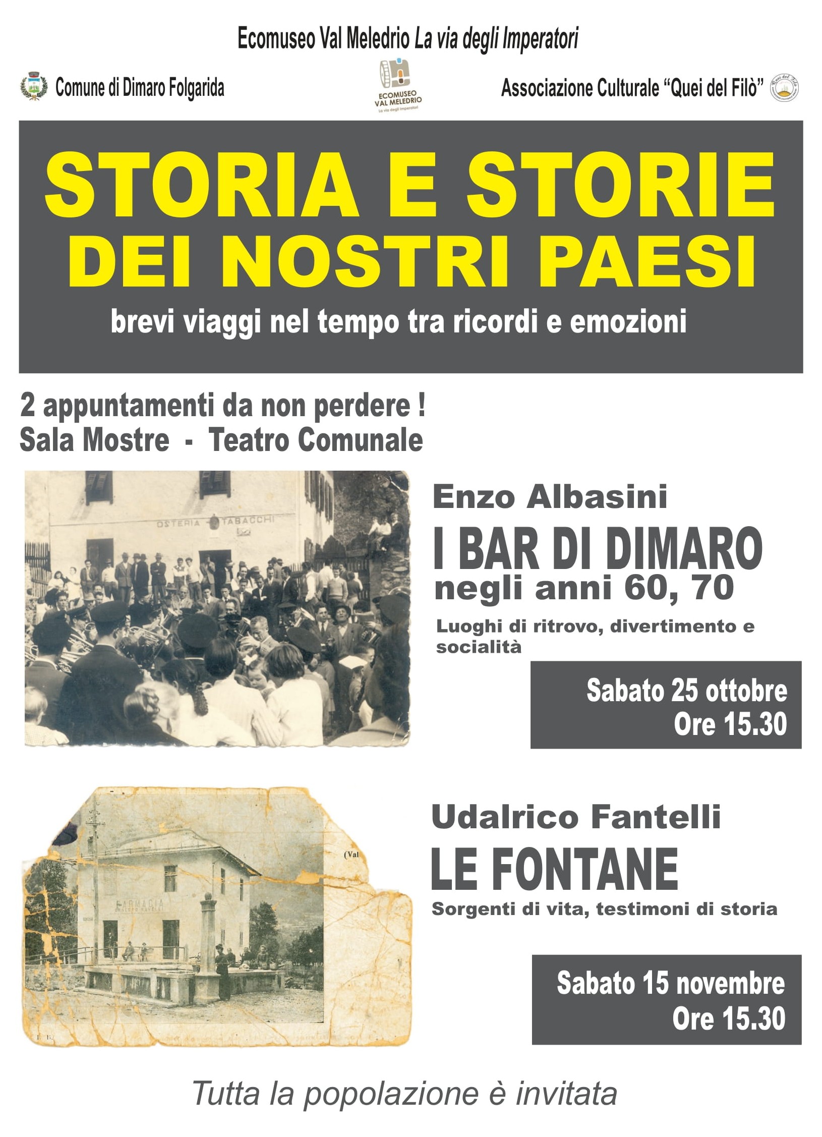 Le fontane hanno sempre avuto una grande importanza nella vita dei paesi per i loro molteplici usi: acqua per l'alimentazione degli uomini ma anche del bestiame, per la pulizia, per l'igiene, per i più diversi usi domestici e anche per l'antincendio. In questo incontro il prof. Udalrico Fantelli ci illustrerà il valore della fontana nella storia e nell'economia del paese di Dimaro, ma andrà anche alla "fonte" illustrandoci la Valle del torrente Meledrio lì dove le acque si raccolgono per poi finire nelle fontane...